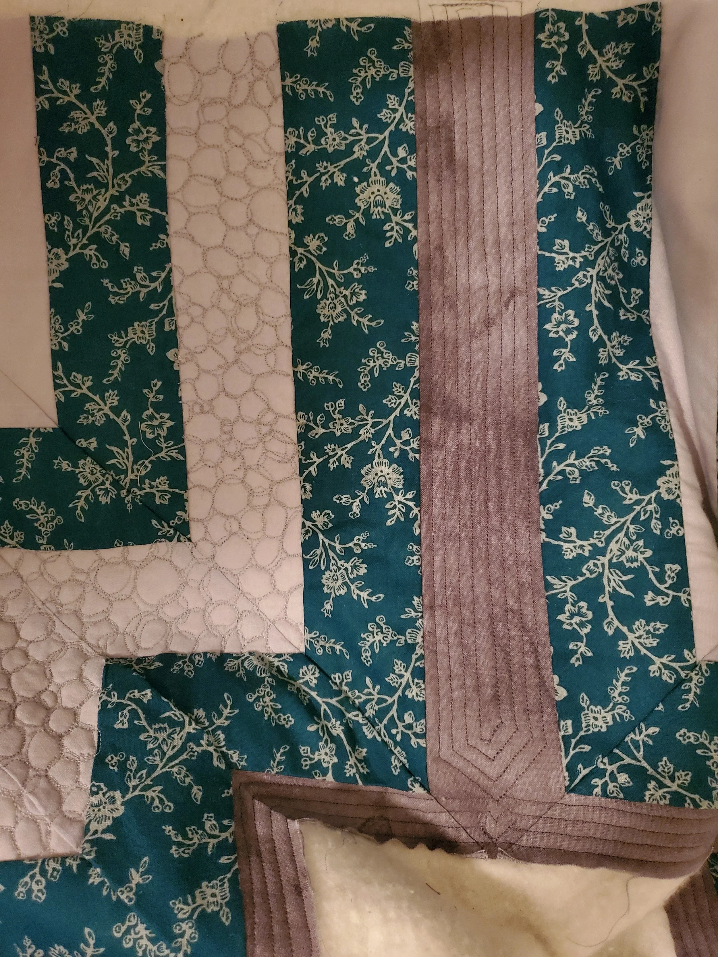 Back of quilt. I used light grey thread to “ghost” the stitching from the front to the back