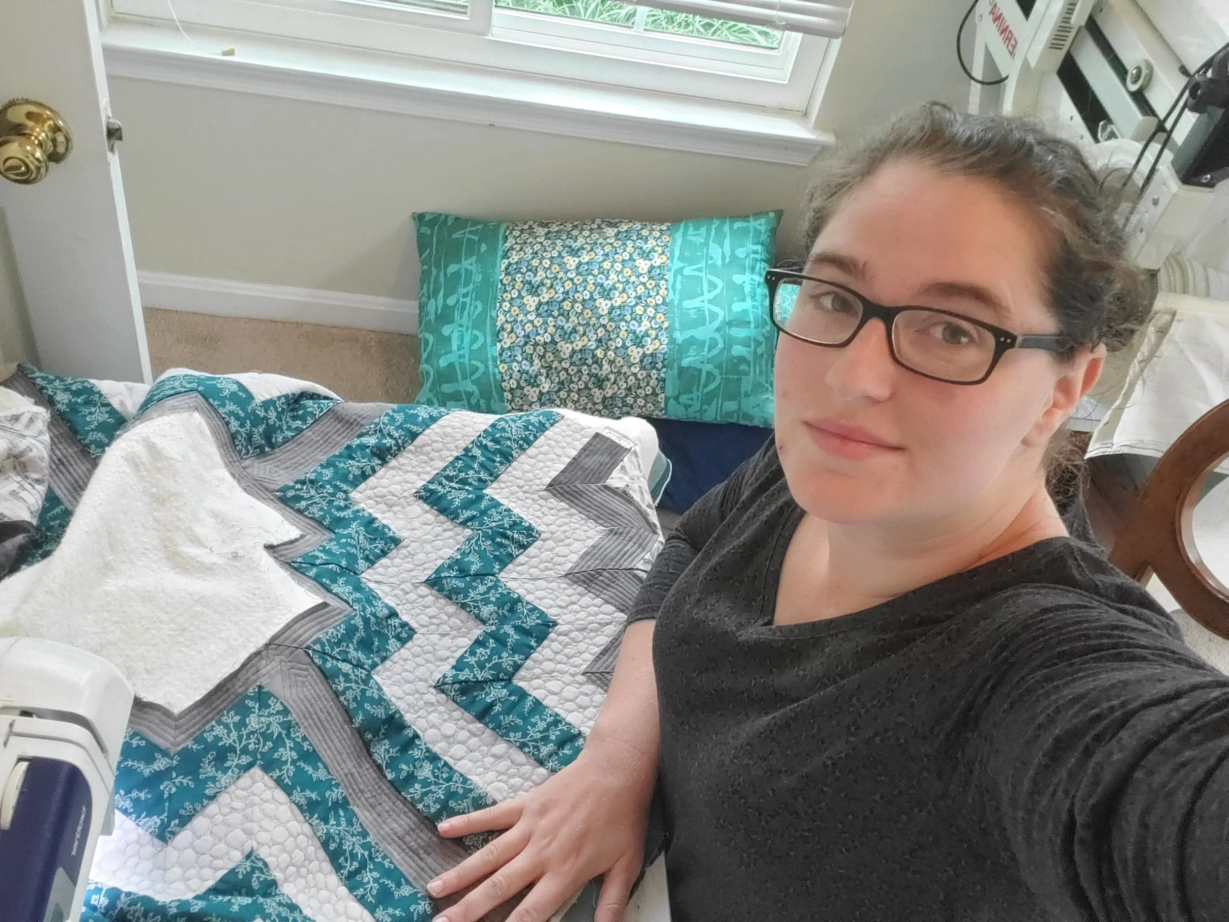 I started by stitching down the medium gray centers. To me, that was the closest I had to a ‘center’. I thought that if I stitched the ‘centers’ of each side of the quilt that I could probably still get close to an even spread of the sandwich. Once I saw that had worked and there was no puckering, I then decided to follow the zig-zags out from the center as well, using a pebbled free-motion stitch to add some fun texture to the light grey areas of the quilt. In trying to keep the spread of the fabric similar, I would ‘pebble’ one zig-zag, then rotate the quilt 90 degrees, pebble the same sized zig-zag as the first, rotate and repeat, until all the light gray zig-zags were completed.