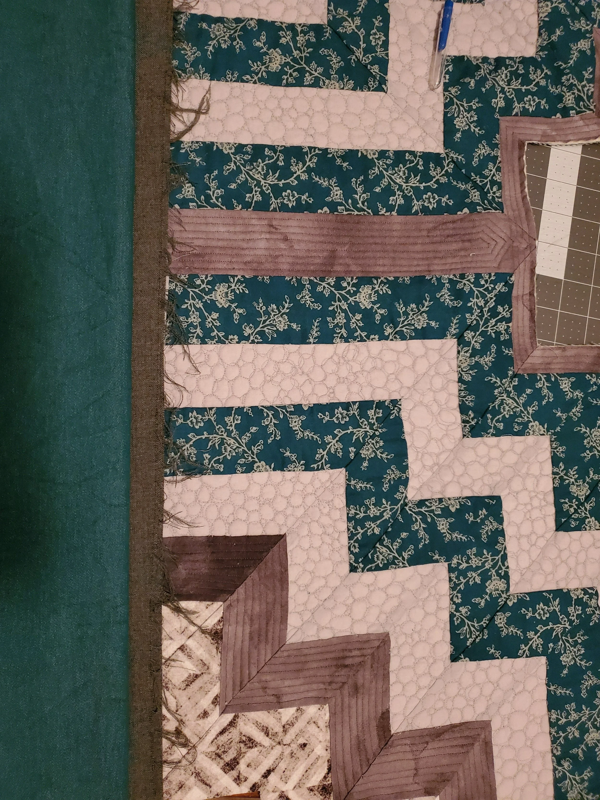 Originally I had planned to make a strip-pieced quilt. When I was about two-thirds of the way through cutting, I realized I had cut a strip incorrectly and the pattern I originally wanted to create was no longer possible. Since I was using scraps, I did not have enough fabric left over to create a corrected piece, so I decided to “make it work”. I realized that if I cut the rest of my strips at a 45 degree angle, I could wrangle the fabric into a cool looking zig-zag shape.