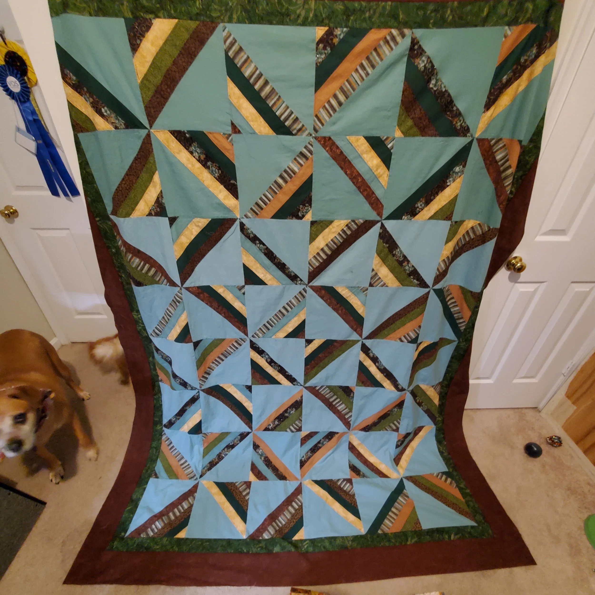 A slightly re-constructed duvet. I added a dark green border to help draw the eye to the greens in the the half-square triangles in the center.