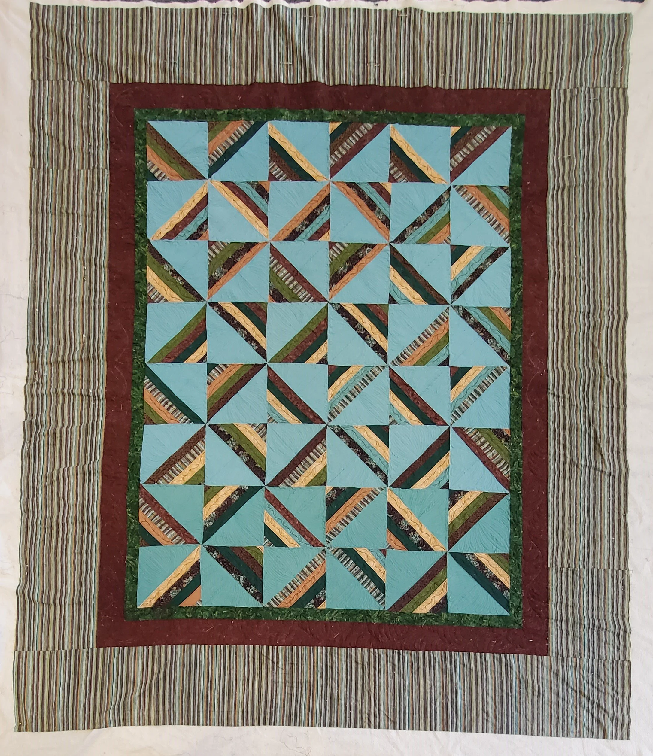 She was tired of looking at the amount of teal in the original duvet and wanted to “tone it down or find some way to balance it better”. Knowing that most of the fabrics used were on clearance 10 years ago, there was no way we were going to find those fabrics again. So, I suggested that we add some borders and use other colors within the fabric strips as a sort of ‘color guide’. That way we could get more modern fabrics that were within the color family (Teal, Brown, and Green), but wouldn’t have to stress about an exact match. I also knew that bringing other colors in would help ‘tone down’ the teal and give the eye a place to rest – especially because I was gonna have to use the backing fabric as part of the expanded quilt.